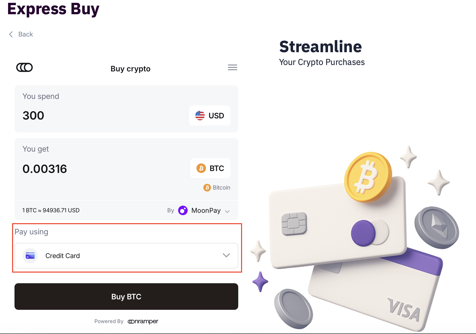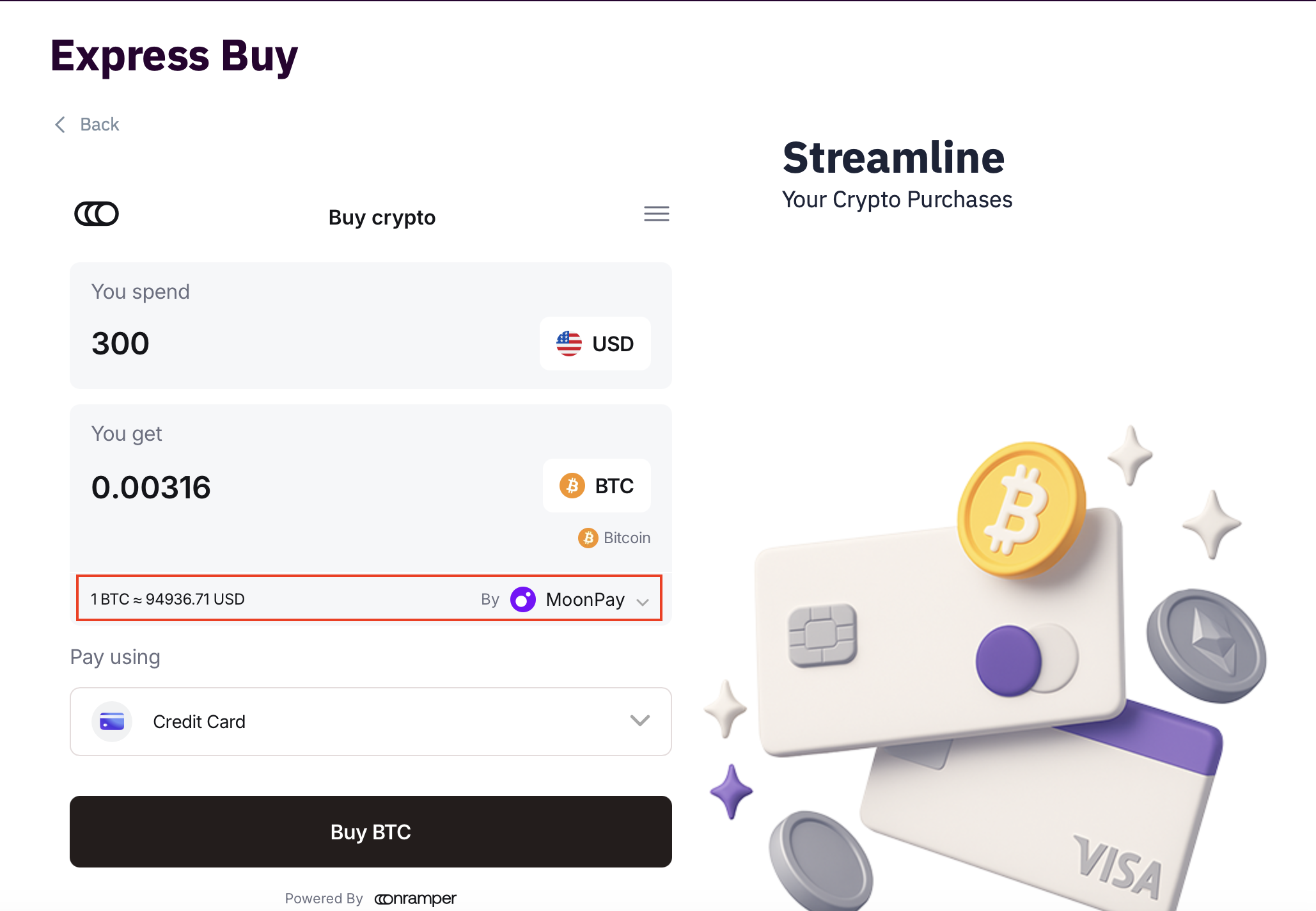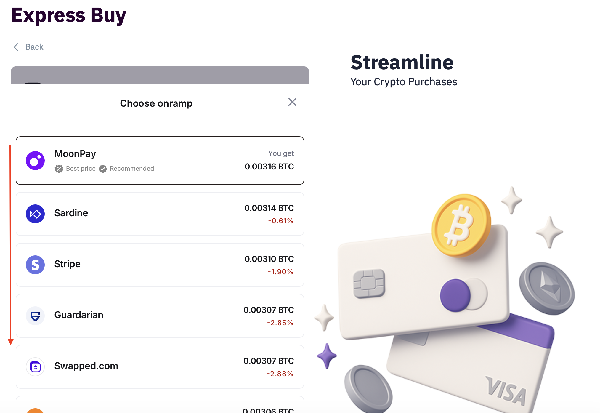 Note: Available providers vary based on the selected fiat currency, cryptocurrency, and payment method. If a provider is unavailable or does not work, simply choose another option.