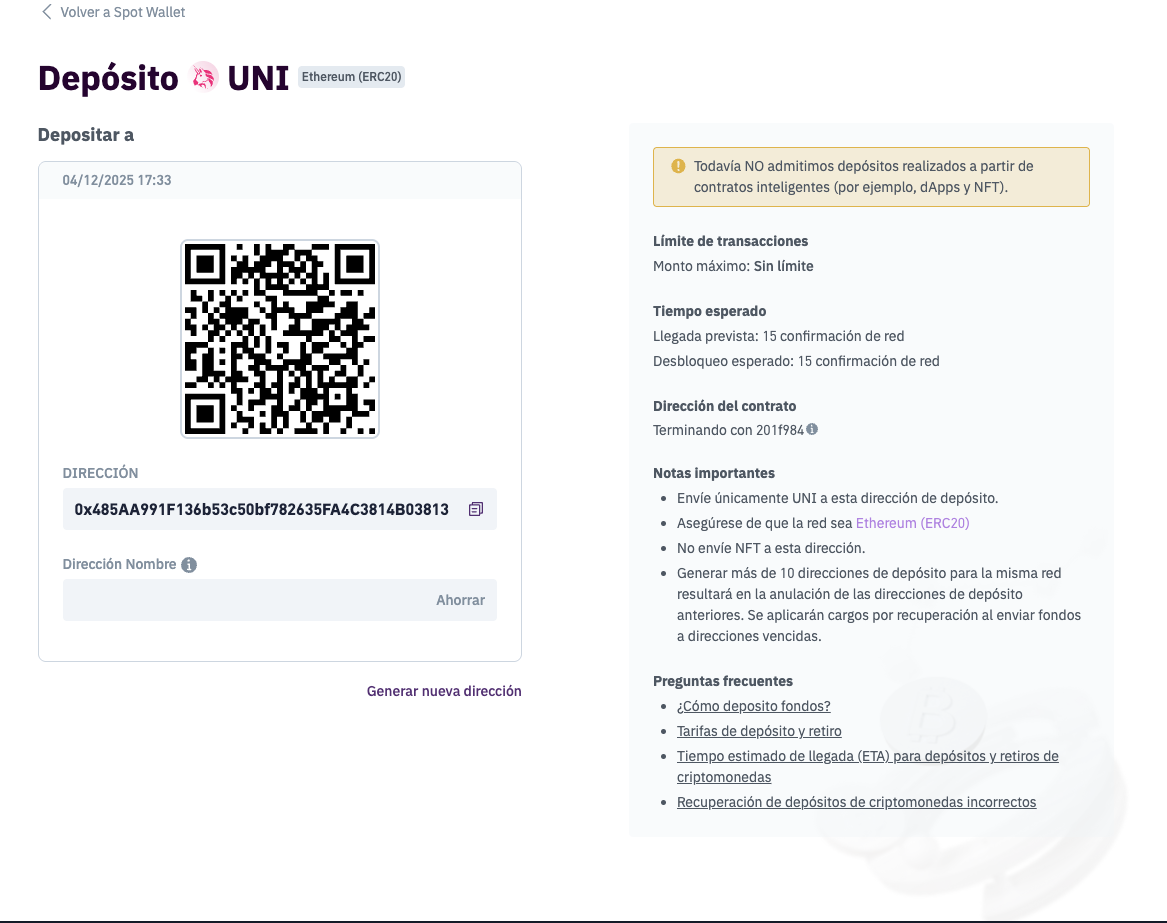 Verifique siempre la dirección antes de realizar el depósito. Los fondos enviados a una dirección incorrecta no se pueden recuperar.