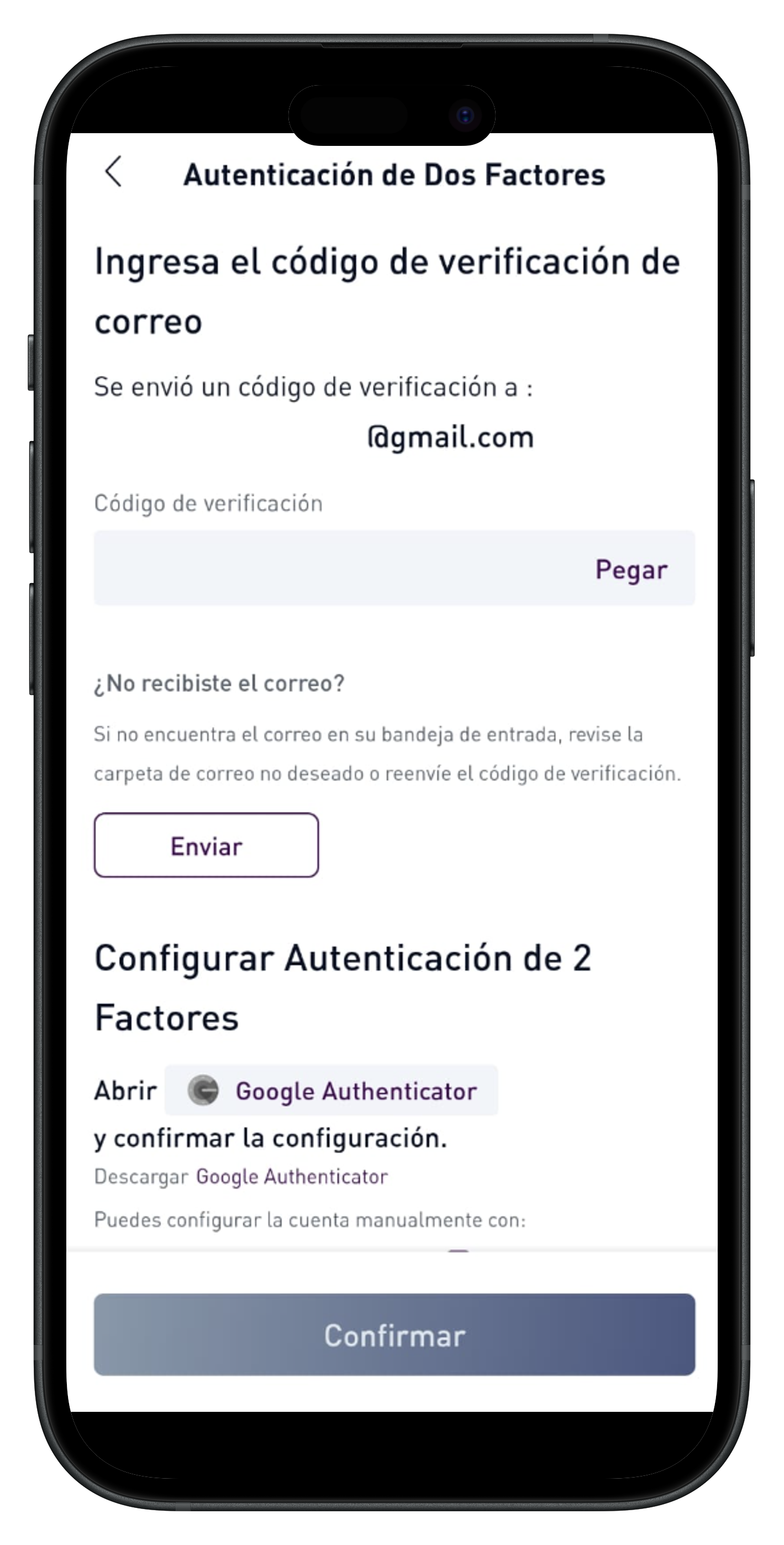 - Configure 2FA manualmente o mediante código QR y toque Confirmar.