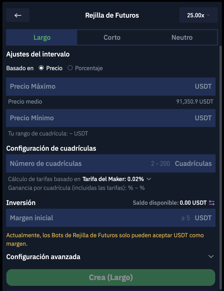 Corto : Ideal para mercados bajistas con tendencia y volatilidad. Puedes abrir una posición corta con un bot de trading de Futures Grid.