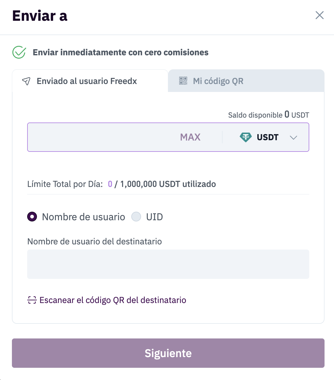 - Completa el formulario indicando la moneda fíat/criptomoneda, el monto de la transacción, el nombre de usuario del destinatario y su dirección de correo electrónico, luego haz clic en "Siguiente".