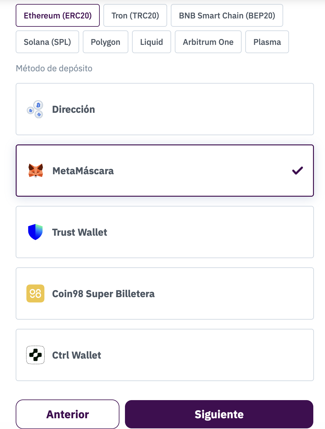 - Selecciona “MetaMask” como método de depósito y haz clic en “Siguiente”.