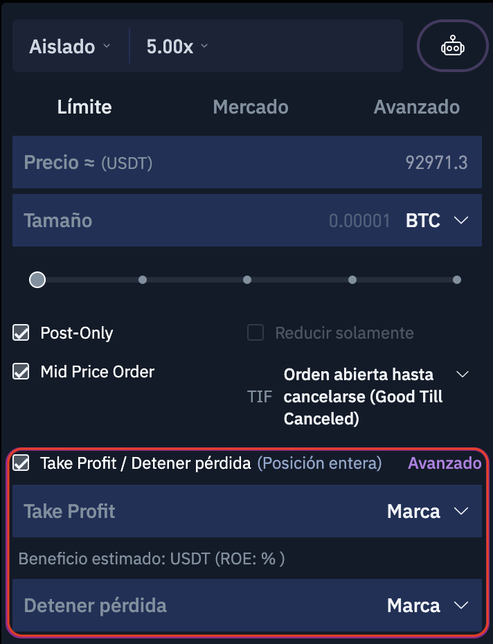 TP/SL Avanzado: Este tipo de orden ofrece mayor flexibilidad, permitiendo a los traders establecer TP y SL para un tamaño específico. También puede utilizarse para abrir nuevas posiciones.