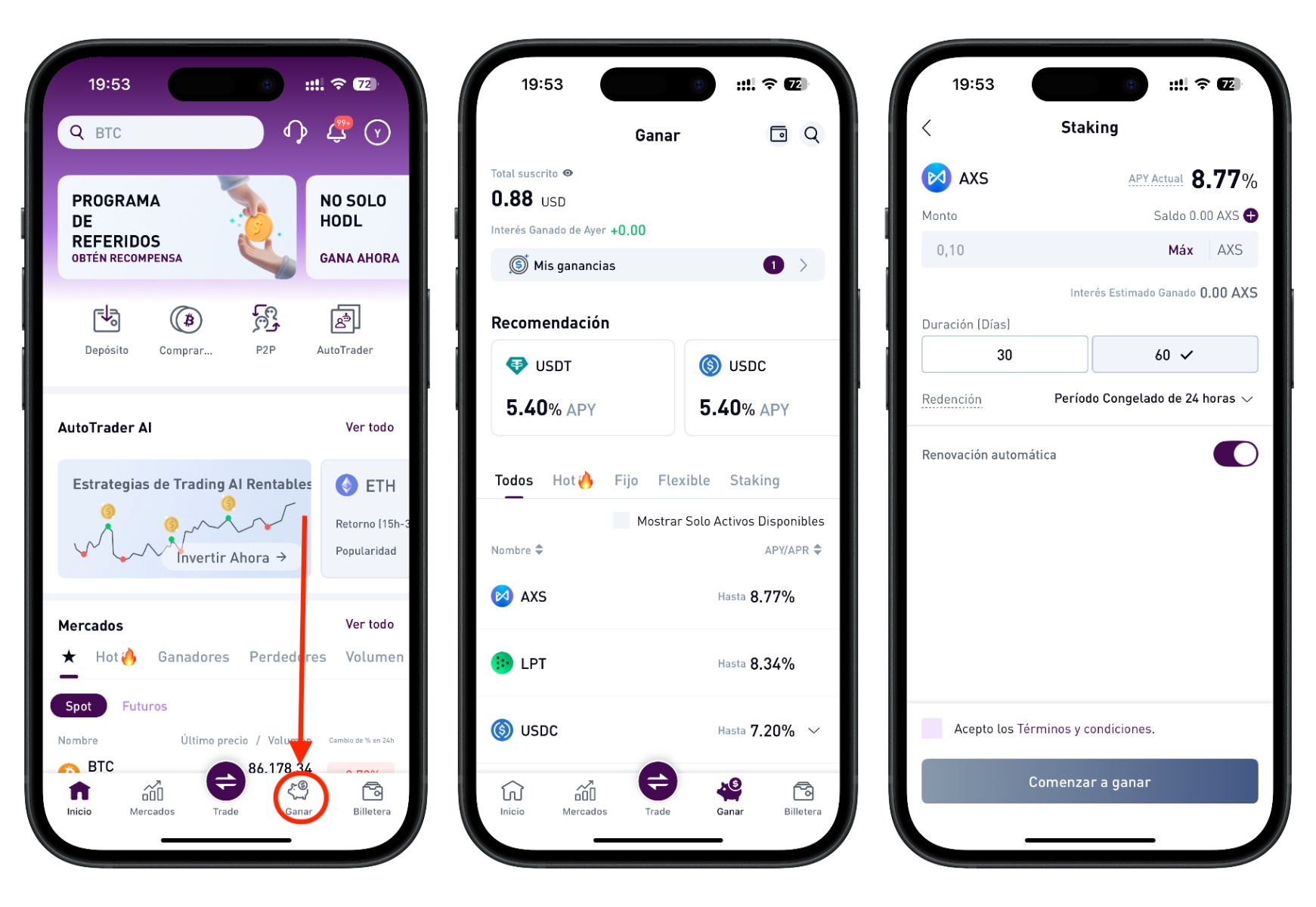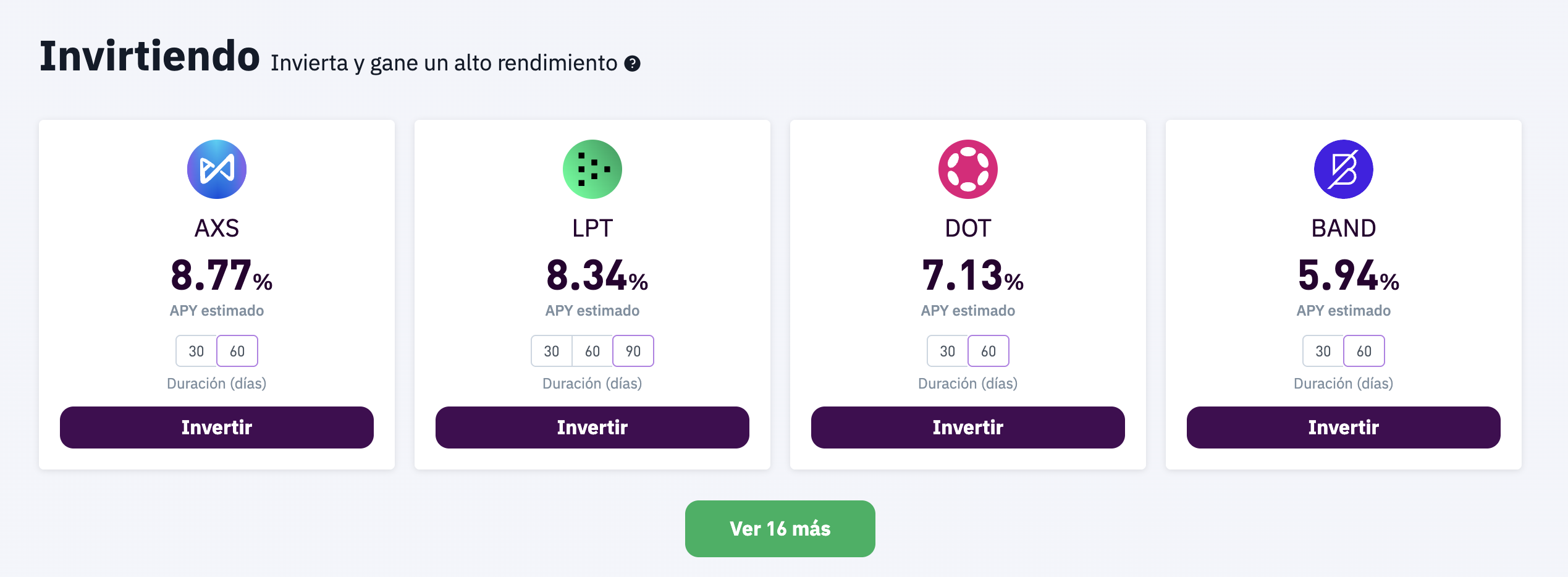 - Staking a plazo fijo: Elige entre 30, 60 o 90 días.