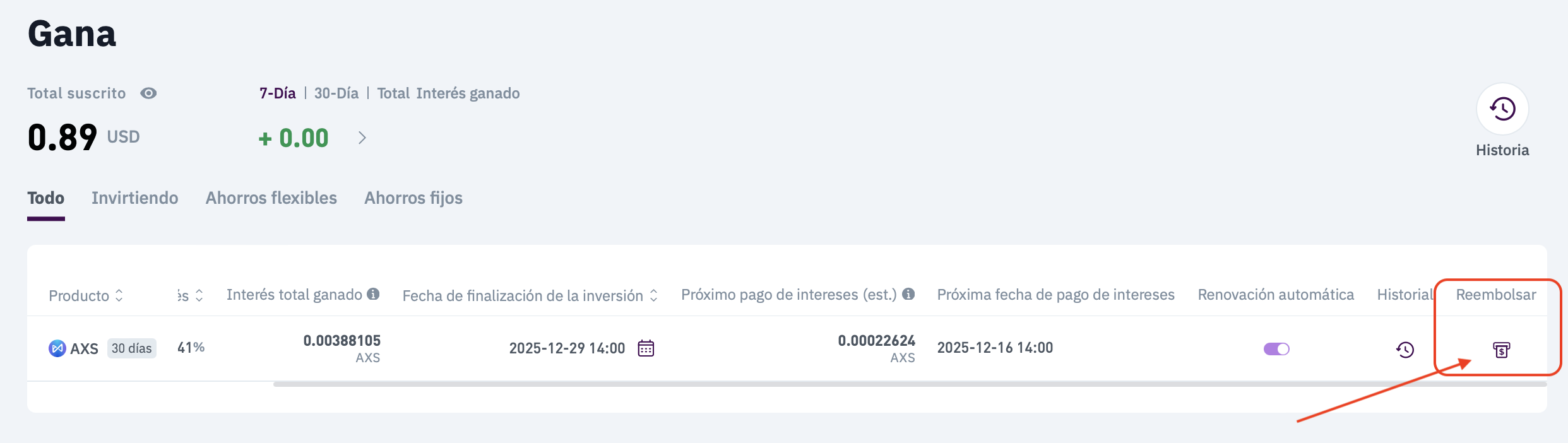 Haz clic en “Historial” para ver transacciones pasadas y pagos de interés.