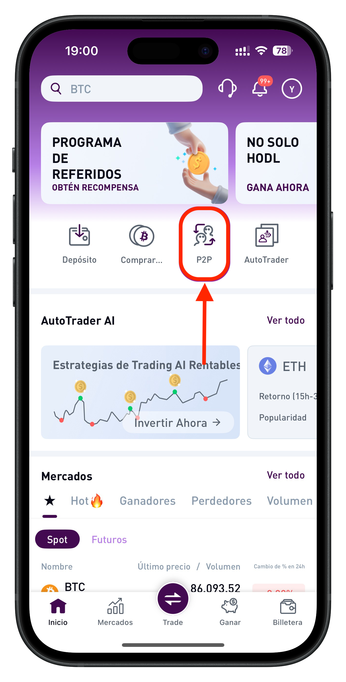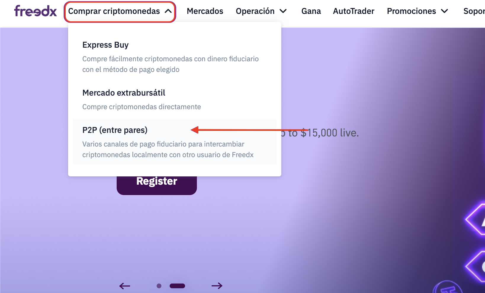 1. Haz clic en “Comprar criptomonedas” y selecciona P2P.