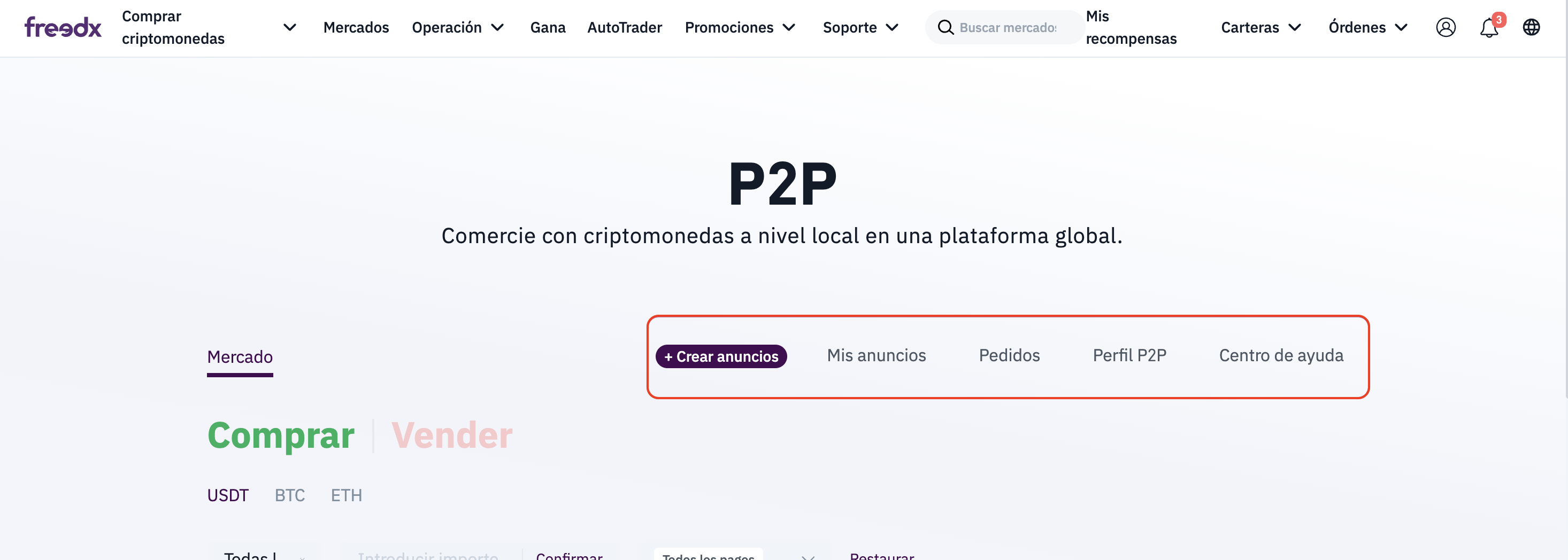 Freedx P2P es un mercado entre pares que te permite comerciar criptomonedas directamente con otros usuarios de Freedx, utilizando tu moneda local, el precio que prefieras y una transferencia bancaria local segura como método de pago.