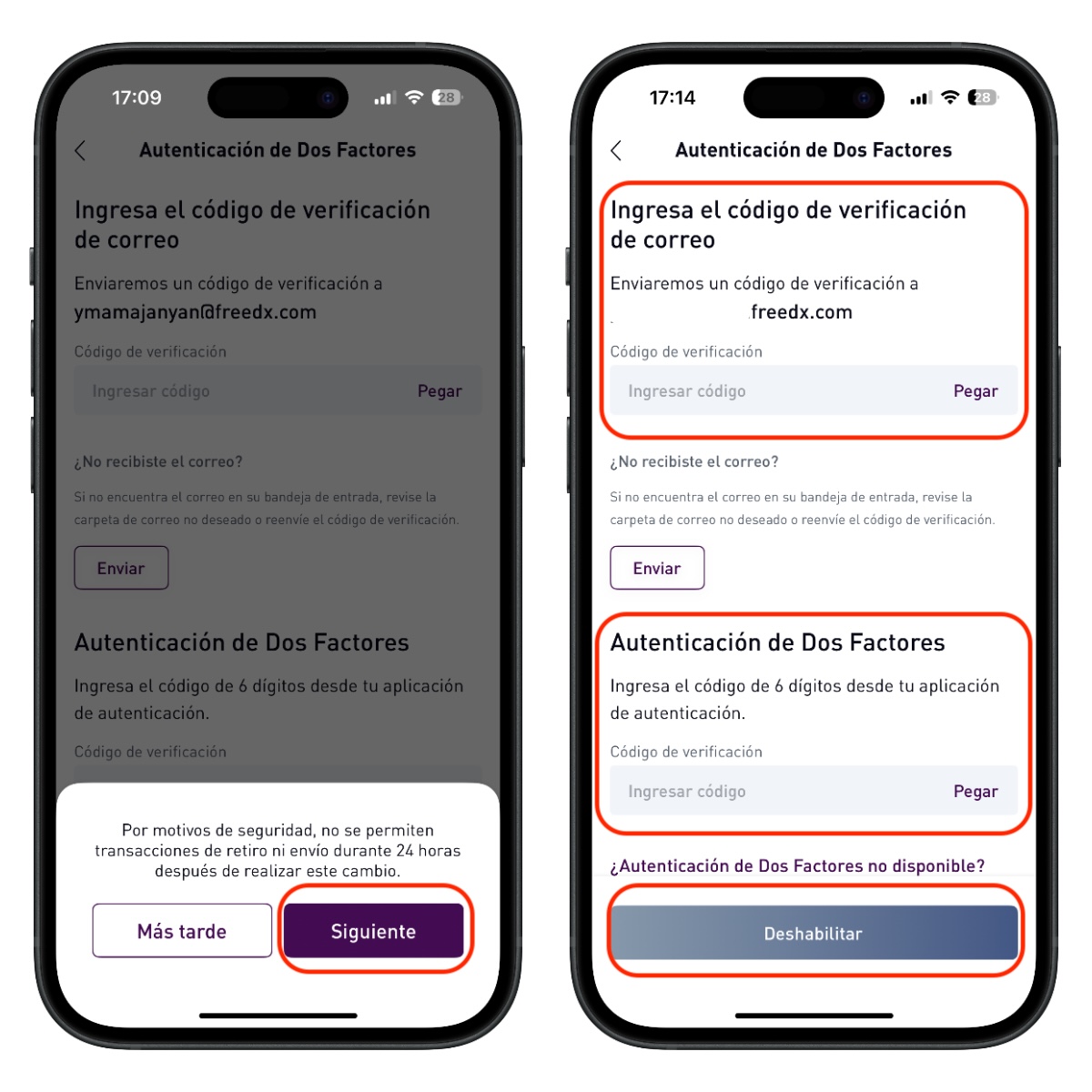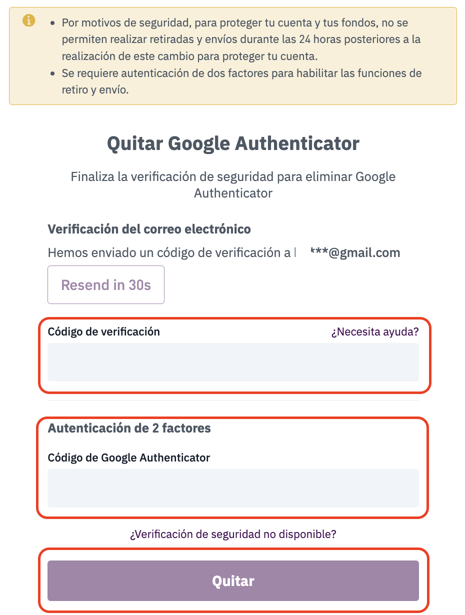Nota importante: Por razones de seguridad, los retiros y las funciones de envío estarán deshabilitados durante 24 horas después de desactivar la Autenticación de Dos Factores, para proteger tu cuenta y tus fondos.