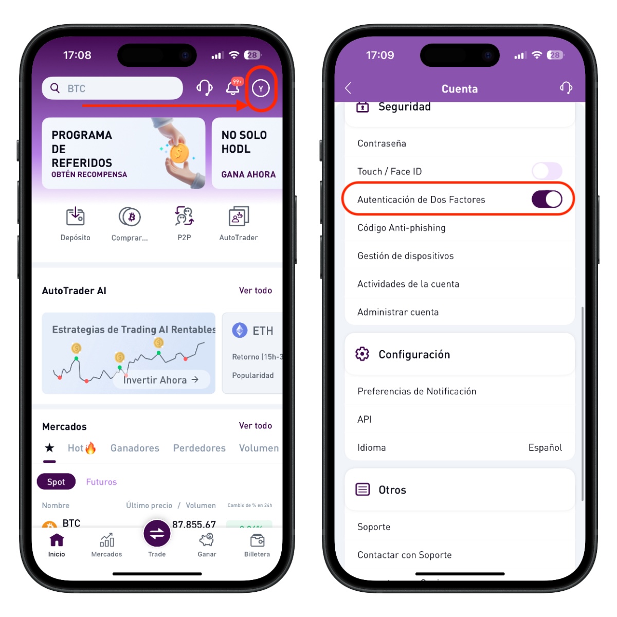 Este artículo explica cómo desactivar la Autenticación de Dos Factores (2FA). La Autenticación de Dos Factores añade una capa adicional de seguridad al requerir un código generado en tu dispositivo móvil. Una vez activada, necesitarás este código temporal cada vez que inicies sesión o realices un retiro.