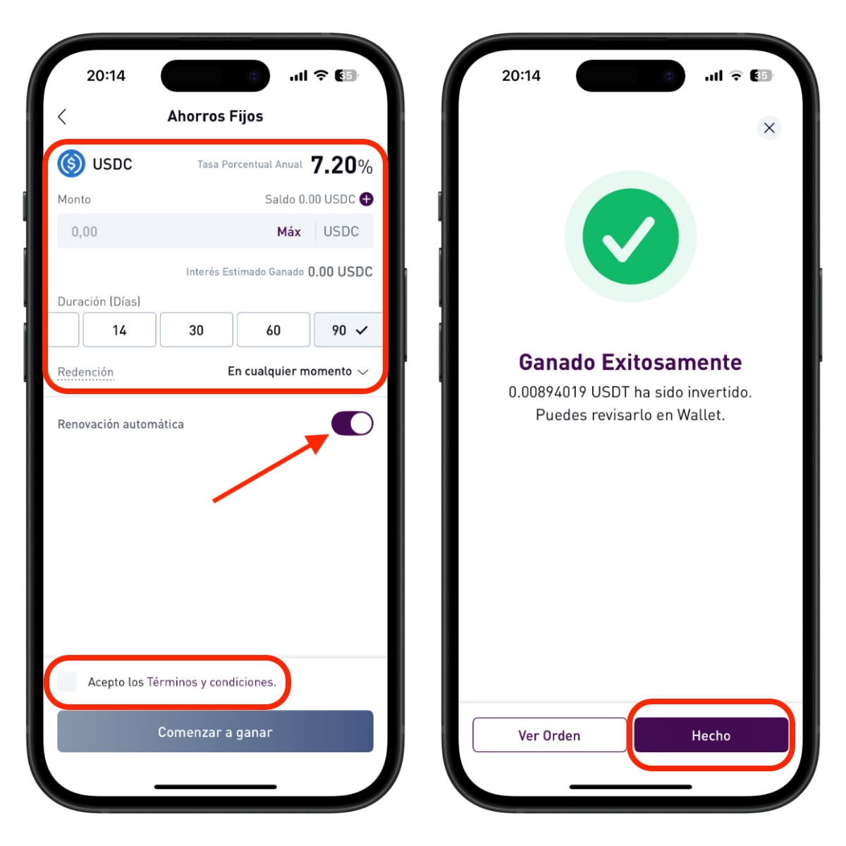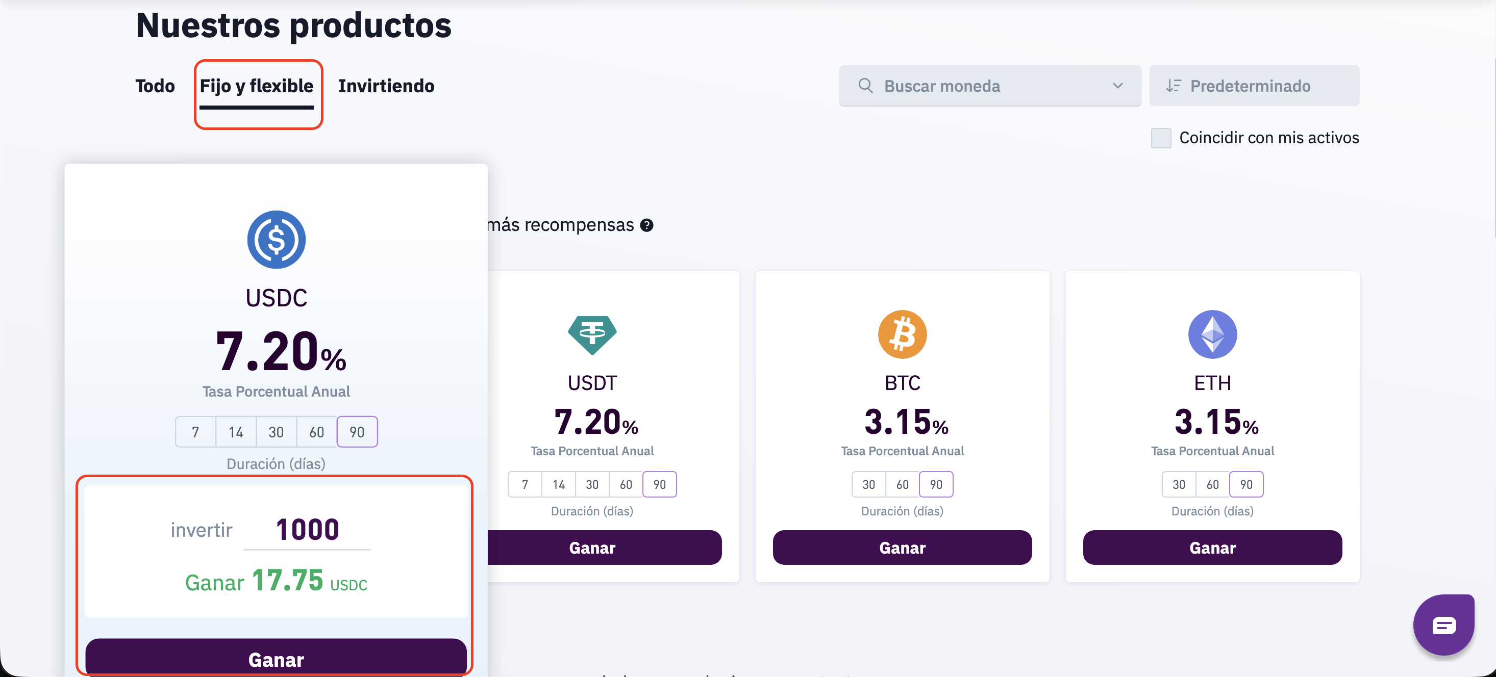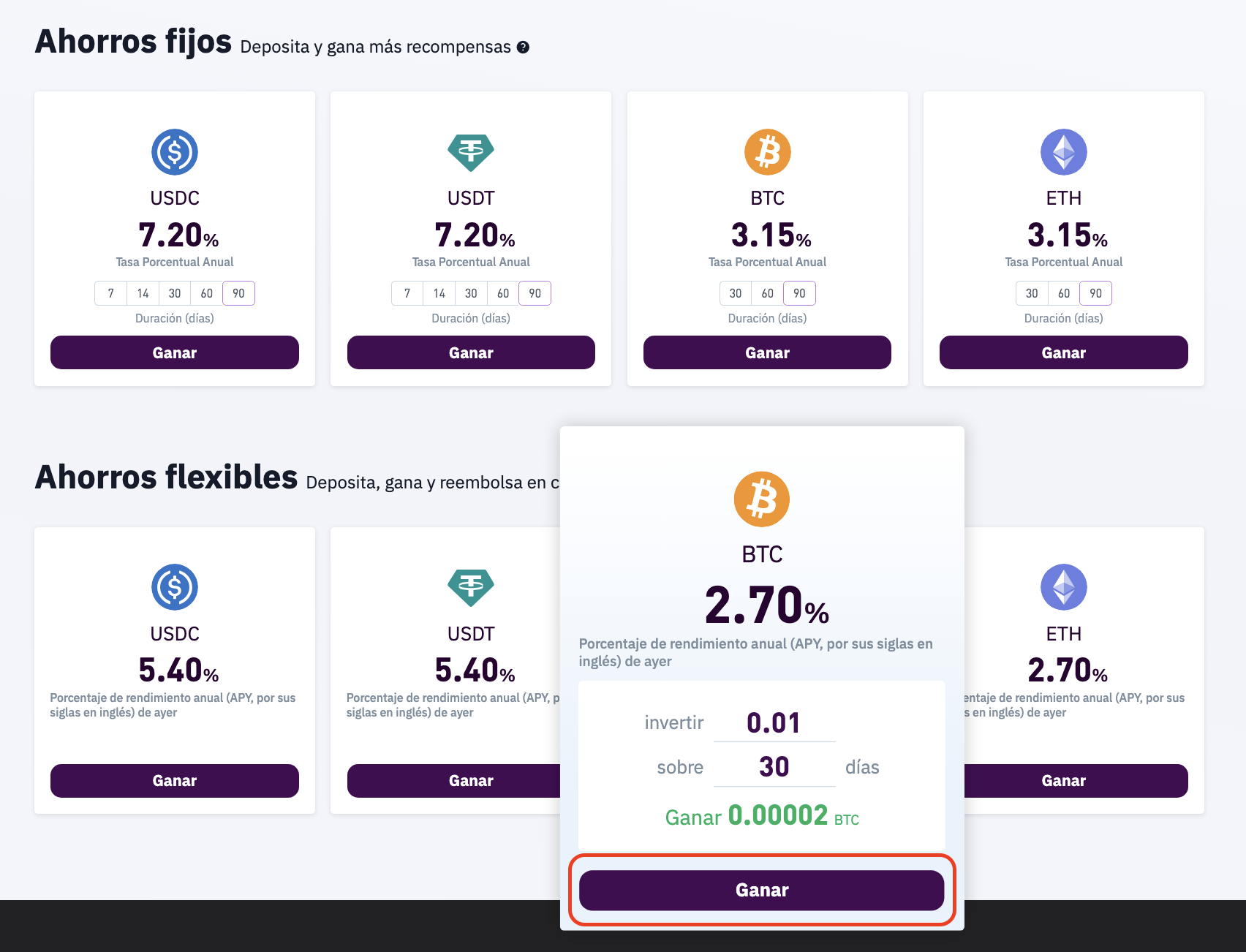 La tasa de interés del depósito a plazo fijo está garantizada durante el período del depósito. El pago de intereses se cancelará en caso de rescate anticipado. Para los productos fijos, el APR (tasa porcentual anual) queda bloqueado en el momento en que depositas tus activos.