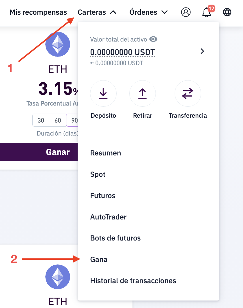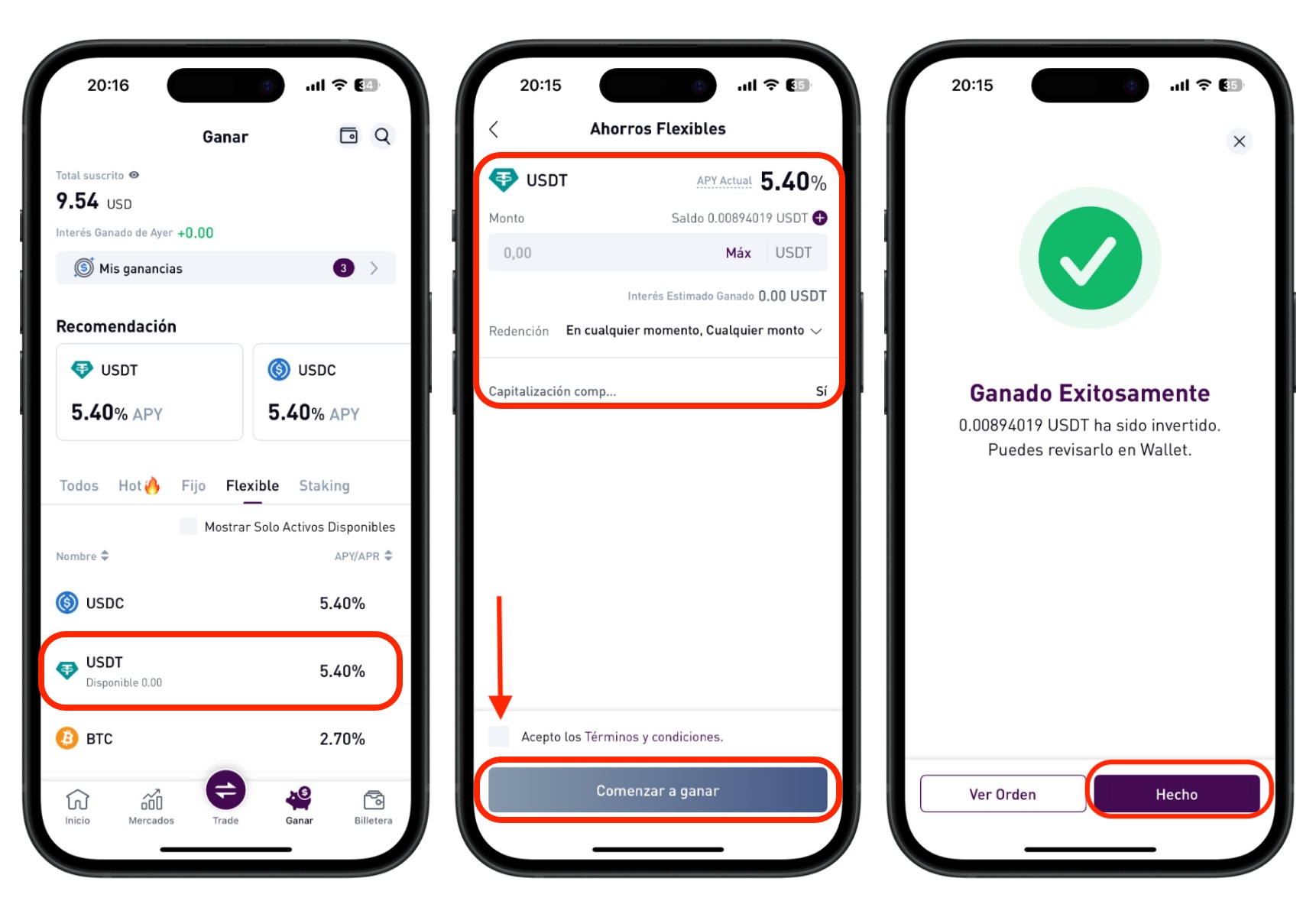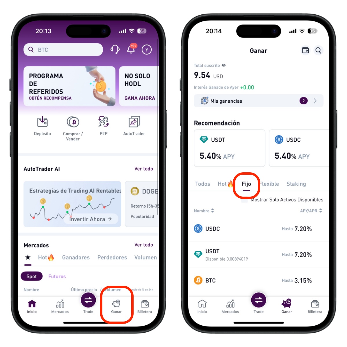 La tasa de interés del depósito a plazo fijo está garantizada durante el período del depósito. El pago de intereses se cancelará en caso de rescate anticipado. Para los productos fijos, el APR (tasa porcentual anual) queda bloqueado en el momento en que depositas tus activos.