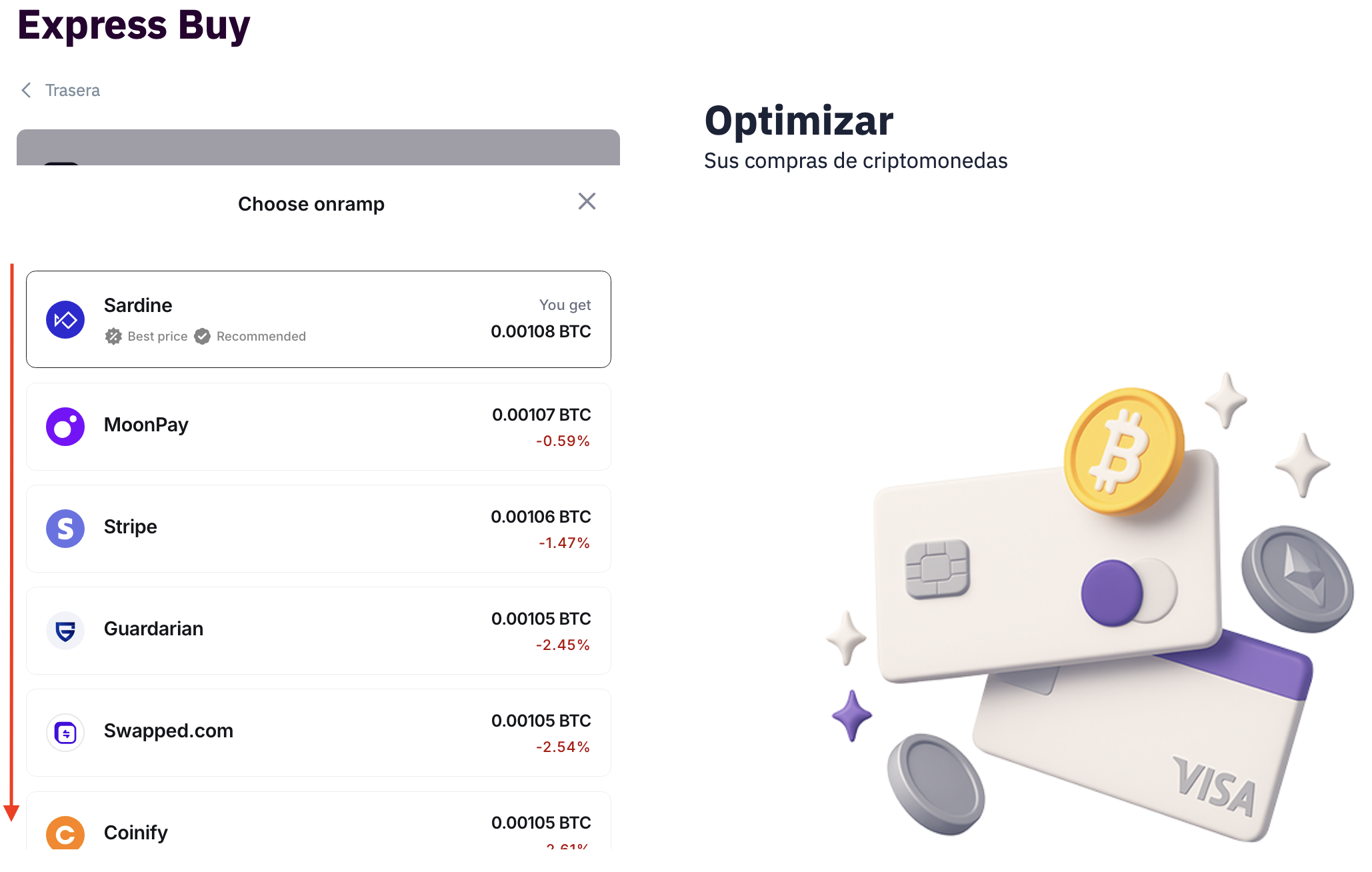 Nota: Los proveedores disponibles varían según la moneda fiat seleccionada, la criptomoneda y el método de pago. Si un proveedor no está disponible o no funciona, simplemente elige otra opción.