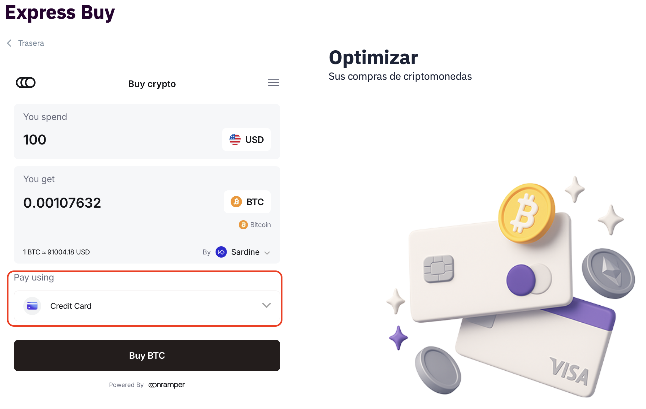 La opción Comprar con tarjeta o transferencia bancaria en Freedx te permite adquirir criptomonedas utilizando moneda fiat a través de los métodos de pago disponibles. Este servicio es proporcionado y gestionado por un proveedor externo, Onramper.