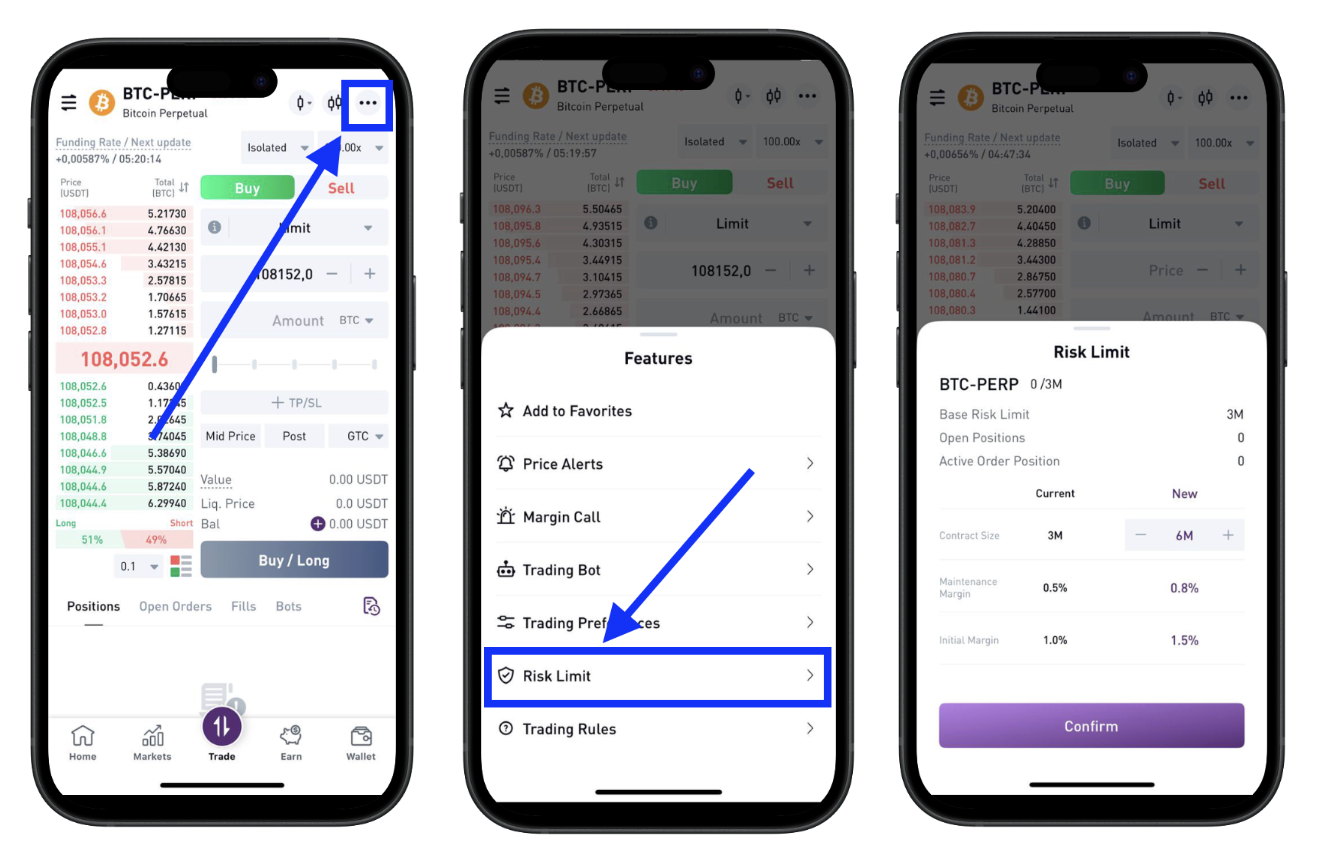 ● Higher risk limits lead to increased initial and maintenance margin requirements, which narrows the gap between your liquidation price and entry price, thus heightening the risk of liquidation or forced market transactions.