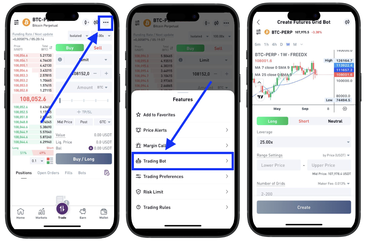 Neutral: Ideal for range-bound markets. You can create buy and sell orders with a Futures Grid Trading Bot without a position.