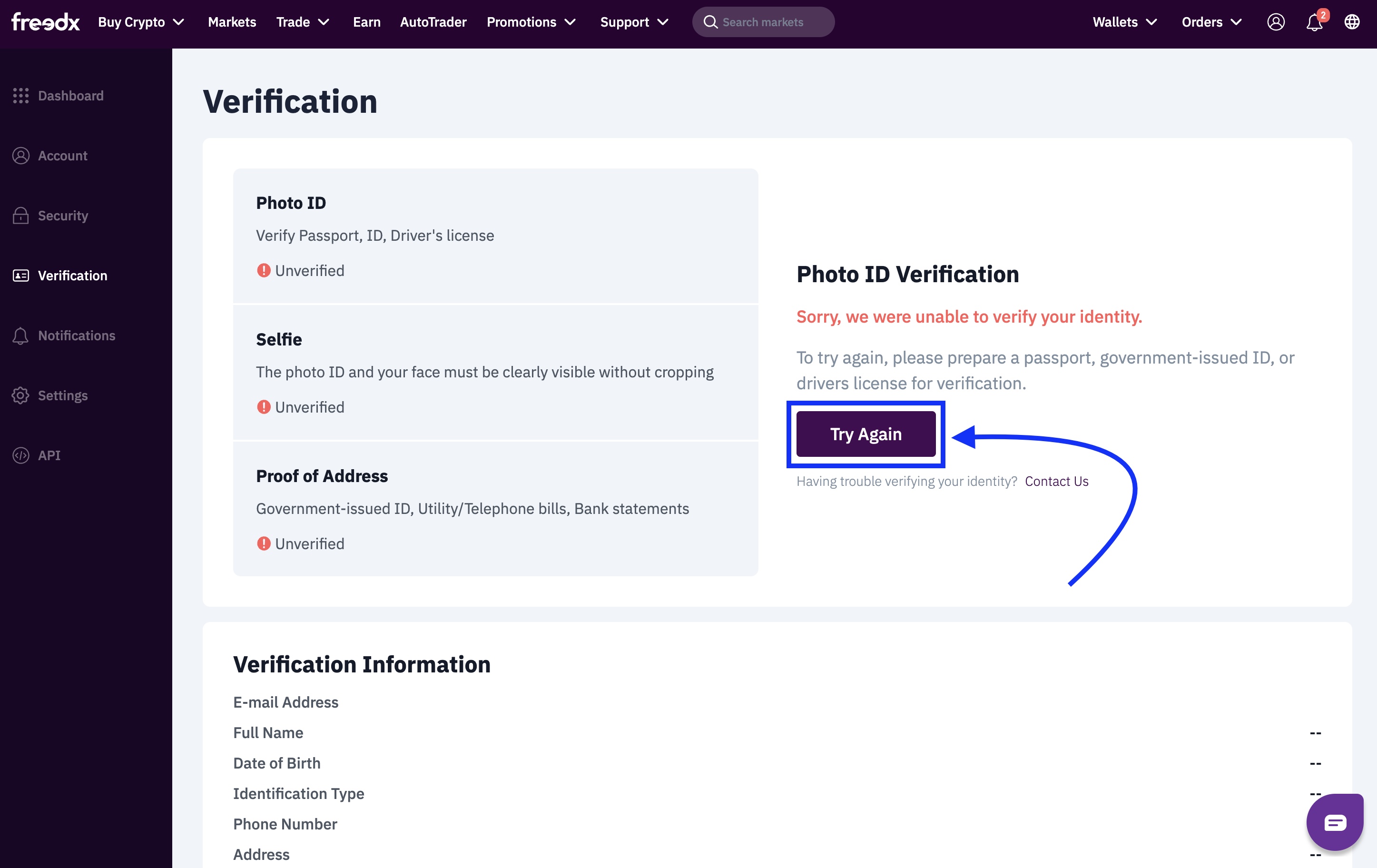 Click on "Try Again" in order to be able to do the KYC verification again.