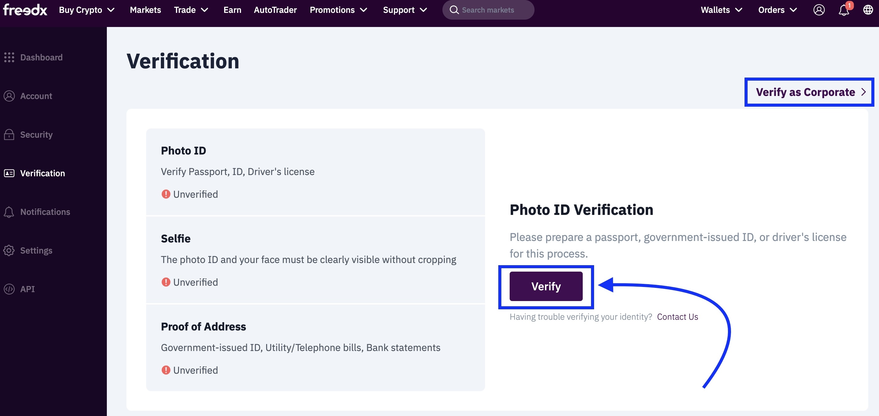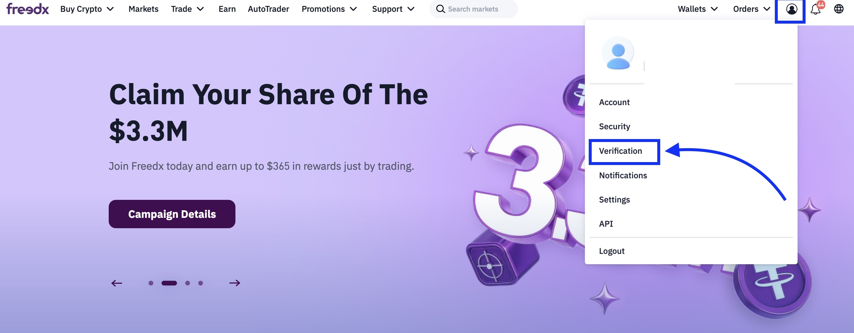 1) Click on the Profile icon (located in the top-right corner of the screen), and select the "Verification" option to open the verification page.