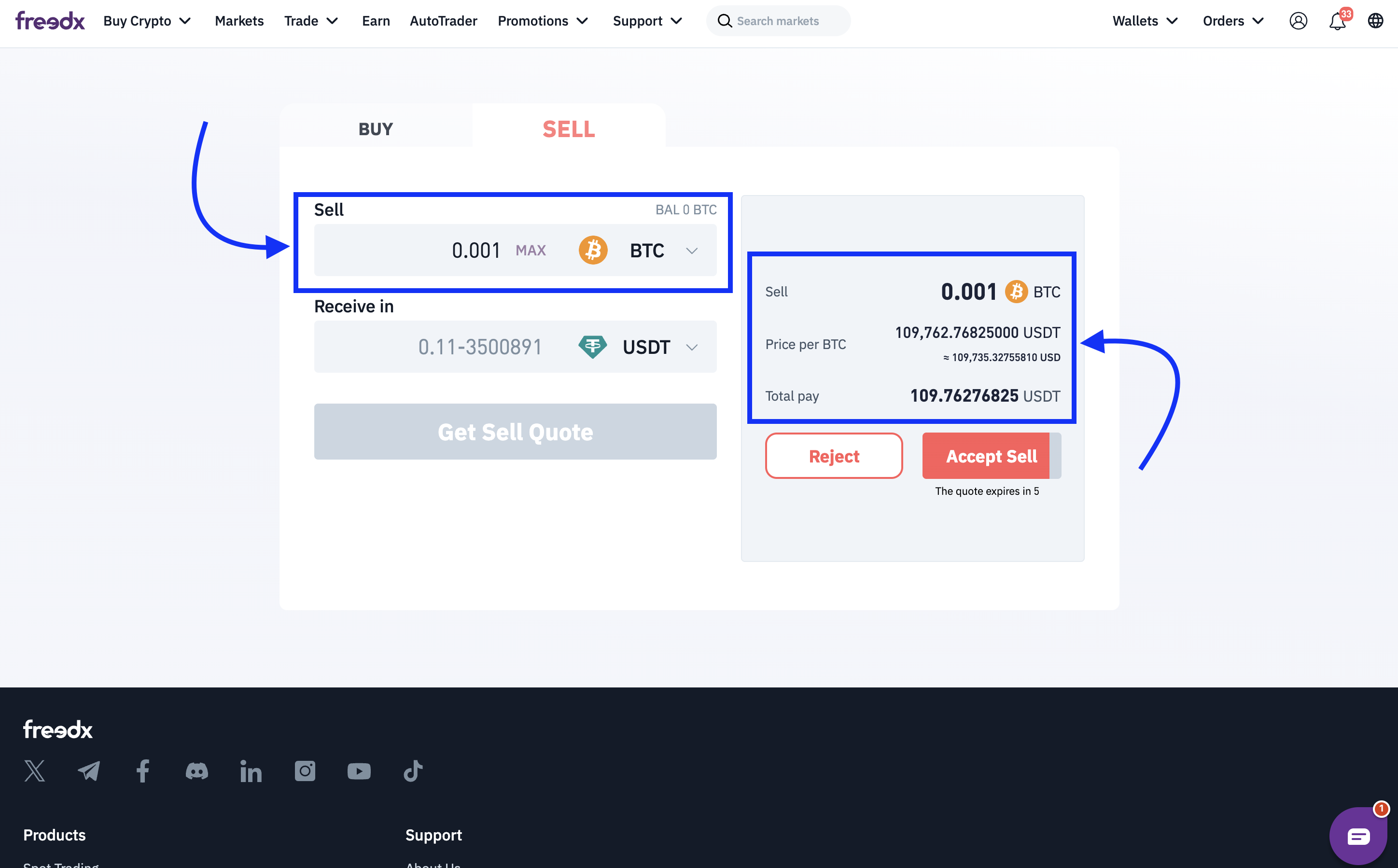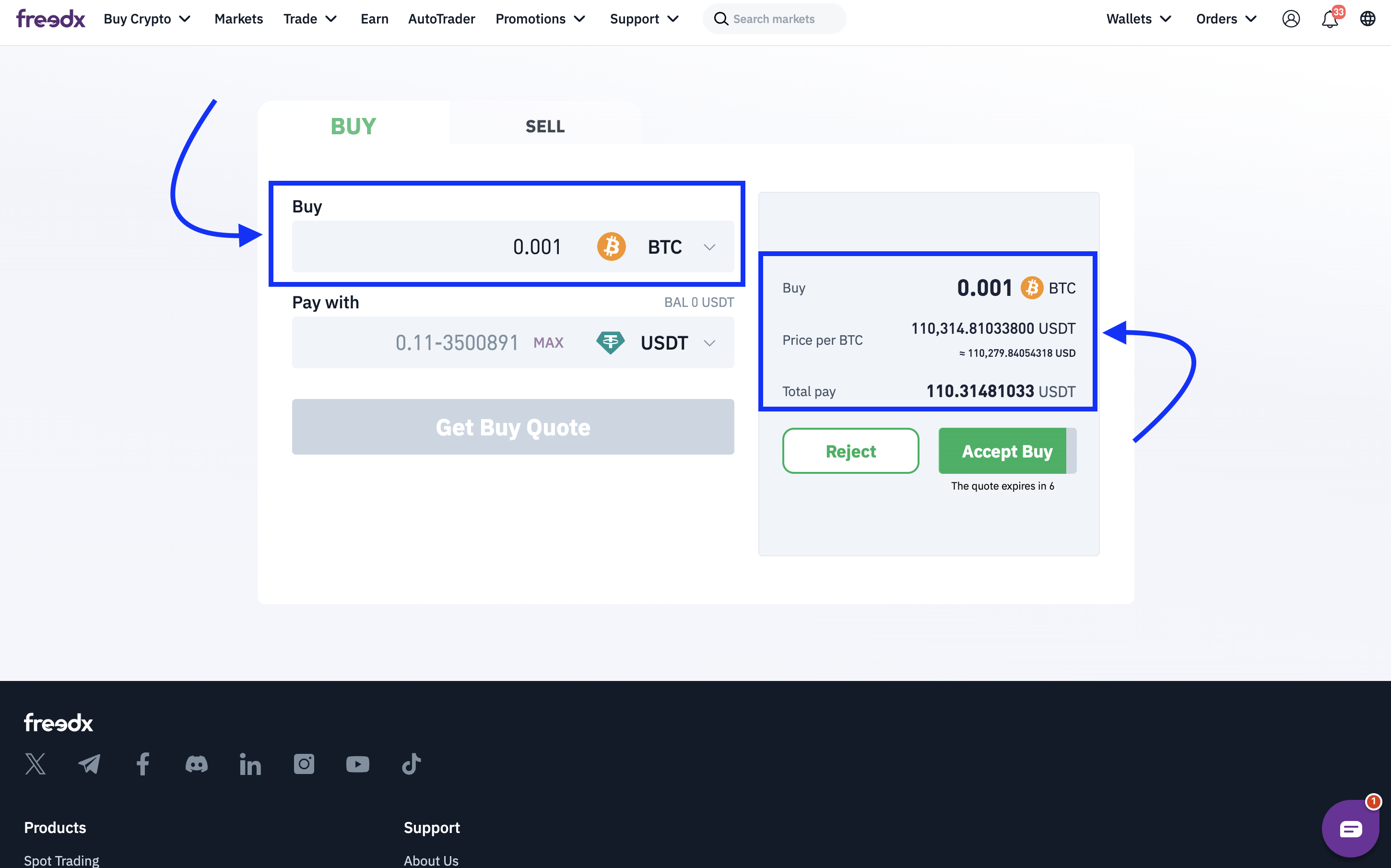 In the Buy example, you can enter the amount of Bitcoin (BTC) you want to purchase and select the currency you would like to pay with, in this case, USDT. After clicking “Get Buy Quote,” Freedx generates a real-time quote that displays:
