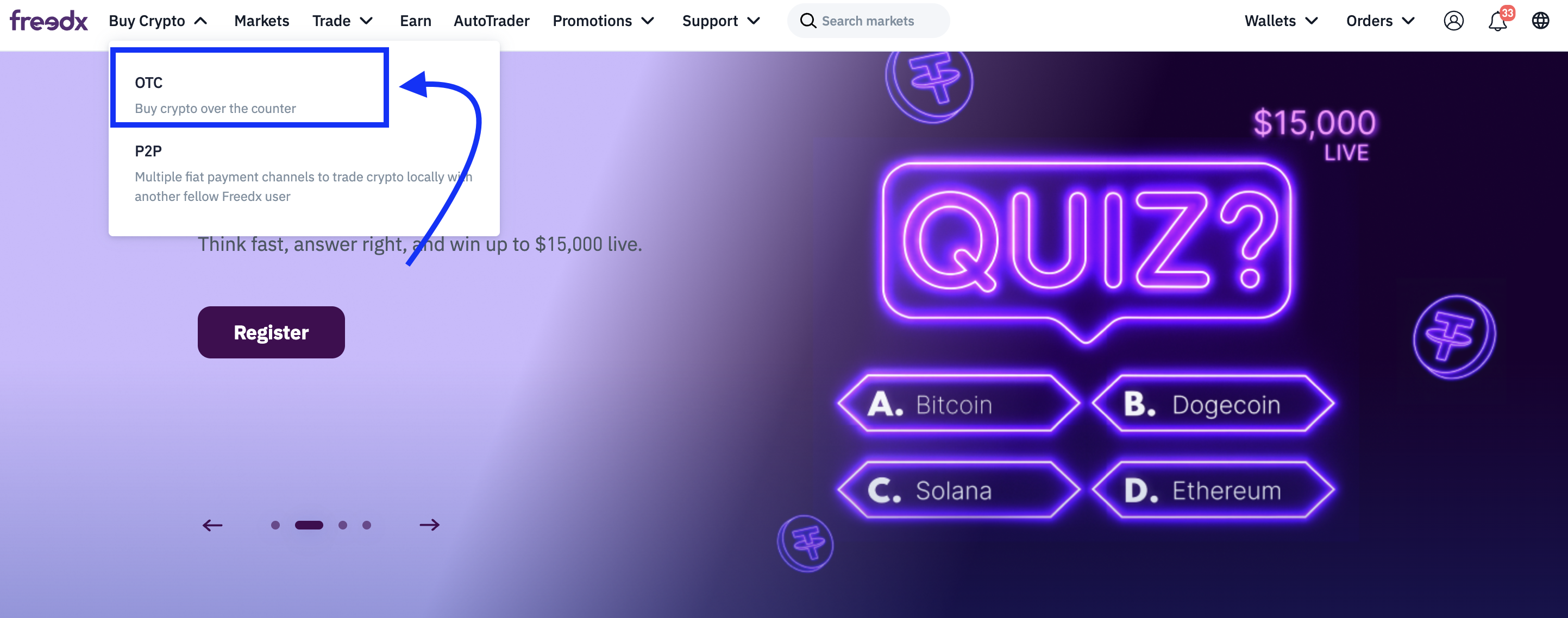Click in "Buy Crypto" in the top left corner of Freedx homepage.