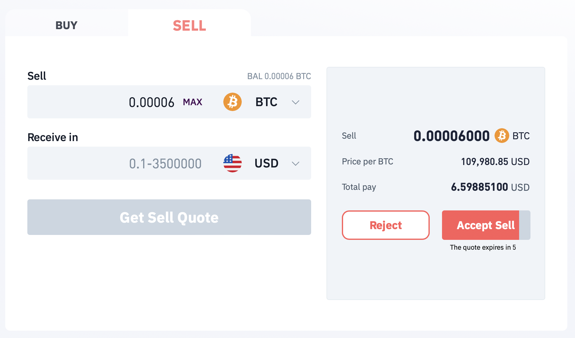 In the Sell example, the process is reversed. You can enter how much BTC you want to sell and select the currency you want to receive. Freedx then provides a fixed quote, for 6 seconds, showing the total amount in USDT you would receive if you proceed.